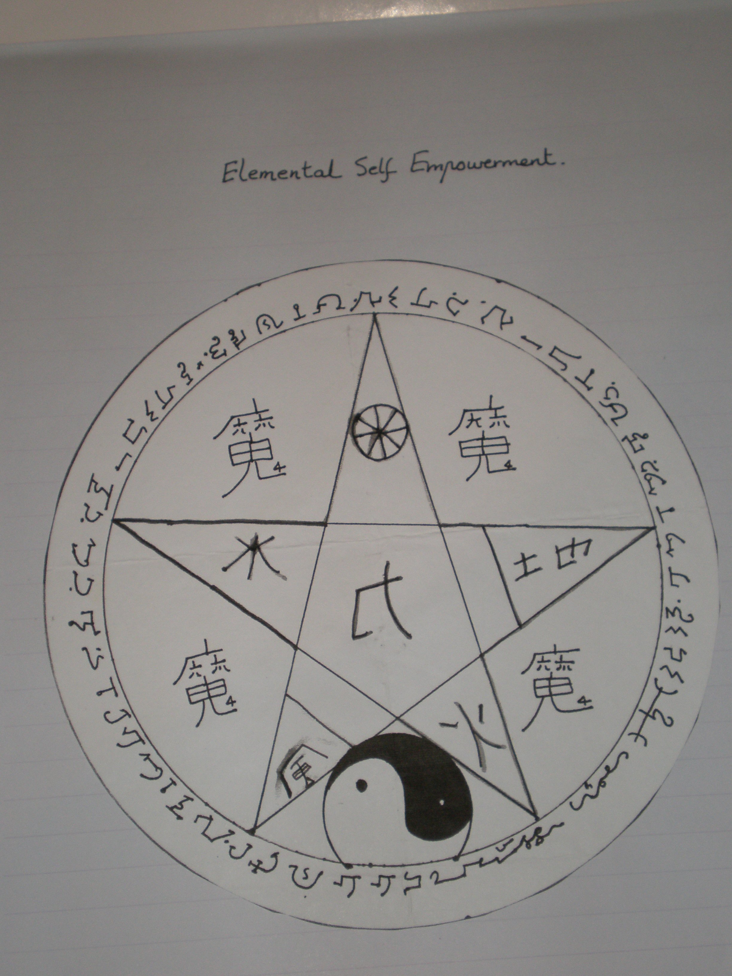 Print this seal and then place in on a table and stand by it. Visualize fire (red), water (blue), air (yellow), earth (green) and Spirit (white) from all around you entering their symbols. To make it clear, spirit is the one in the north with a circle, earth is on the right; water in on the left, fire in on the bottom right and air is on the bottom left. After filling the symbols with their energy for 5-10 min, imagine them bursting with energy. Then visualize the energies coming in straight lines and fusing in the symbol middle of the pentagram (five-pointed star). Visualize the fused energies in a rainbow colour engulfing the entire written text in the pentagram star but mainly staying in the middle. Now put your index finger of any hand in the middle power symbol and visualize all the energy entering and filling your entire body. This energy will give you the power over all the 5 elements.
