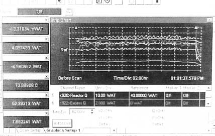 Figure 1. Sample of one stretch of excess power. The exess heat line is marked with an arrow and appears darker than the adjacent lines. The "Ref" line on the Y axis is zero watta excess heat. Vertical scale is 2 watts/division. The cyclic fluctuations are due to furnace cycling to keep the lab warm, as it is winter in New Hampshire. |