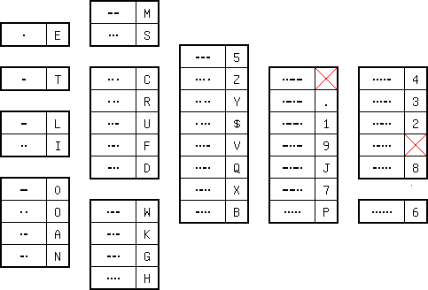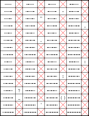 These are the six element codes of the Morse standard. Only a few of the positions are used, and all for punctuation. As above, there are some control codes, but I do not know them yet. Also it appears that some seven element codes have been defined, and even some eight element ones. More information about that might follow later.