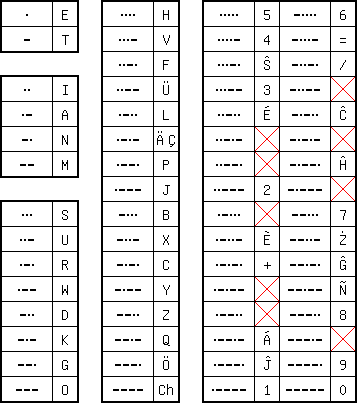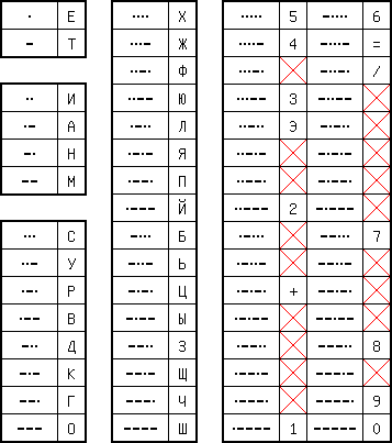 This is the Russian version of Morse. The Cyrillic letters are mapped to similar sounding or similar looking symbols in the Latin script. There is however one deviation from the (ASCII-look-alike) standardGOST 13052. The six element part of the table is not shown here, presumably it is the same as given above.