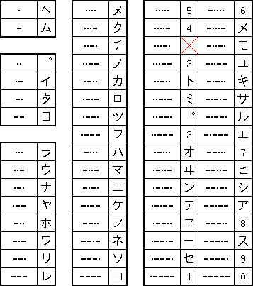 Japanese Morse standard. It gives all full-size Katakana symbols as
