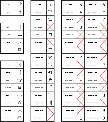 This shows the Korean Morse standard. In it codes are allocated to all Hangul consonants and vowels, plus two diphtongues. Contrary to other Hangul codes initial and final consonants are not distinguished.