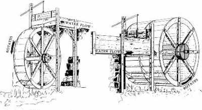The fourteenteenth method is to use a water wheel or mill to turn the turbine fan and create energy from the wood or metal rod that holds the wheel, as it is whirling to cause sparks within the turbine. The energy is cheap yet it will be used only in an area with water streams. The math of this works like this with what I call dimentrics. A dimentric airflow, waterflow or otherflows = dIf = s*E(decimal) = Amps. For how much power (watts), in each device is dimentric power = dP = VA = W. For dimentric of waterflow, t = 2s, E = .27, 2*.27 = .54A * 27V = 14.58W. For more information go to http://inventors.about.com/library/inventors/blwaterwheel.htm and the picture is borrowed from the site.
